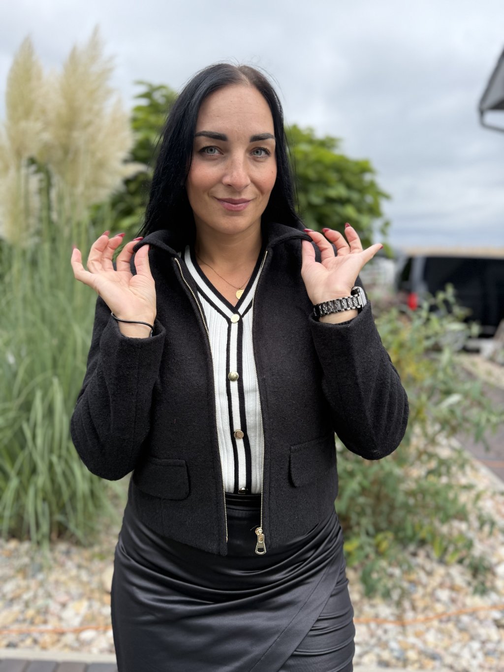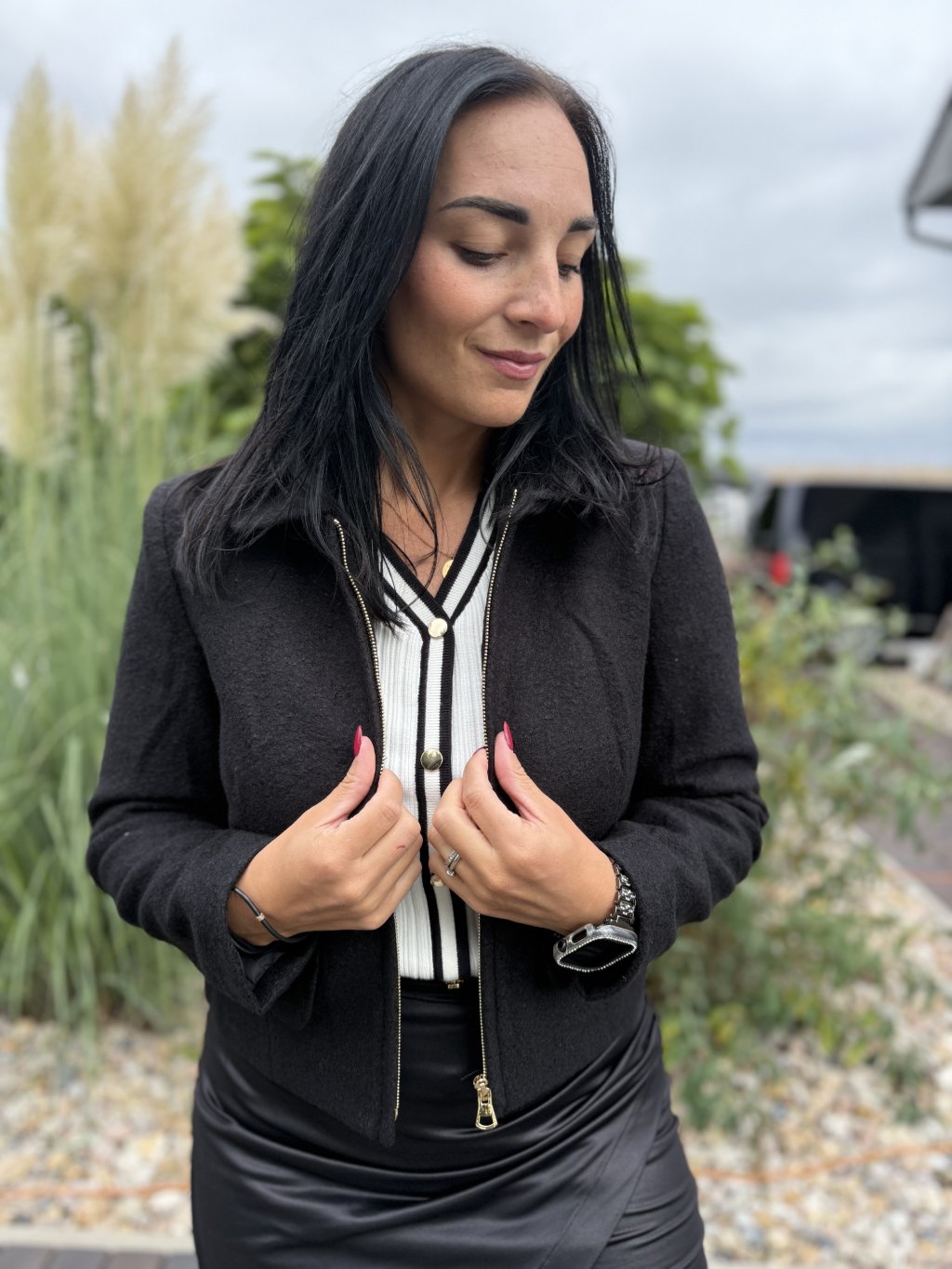 Vsaďte na eleganci a univerzálnost s tímto krátkým dámským kabátem v klasické černé barvě. Kabát je vyroben z jemného, hřejivého materiálu, který krásně drží tvar a poskytne pohodlí během chladnějších dnů. Díky kovovému zipu ve zlaté barvě působí moderně a luxusně zároveň.