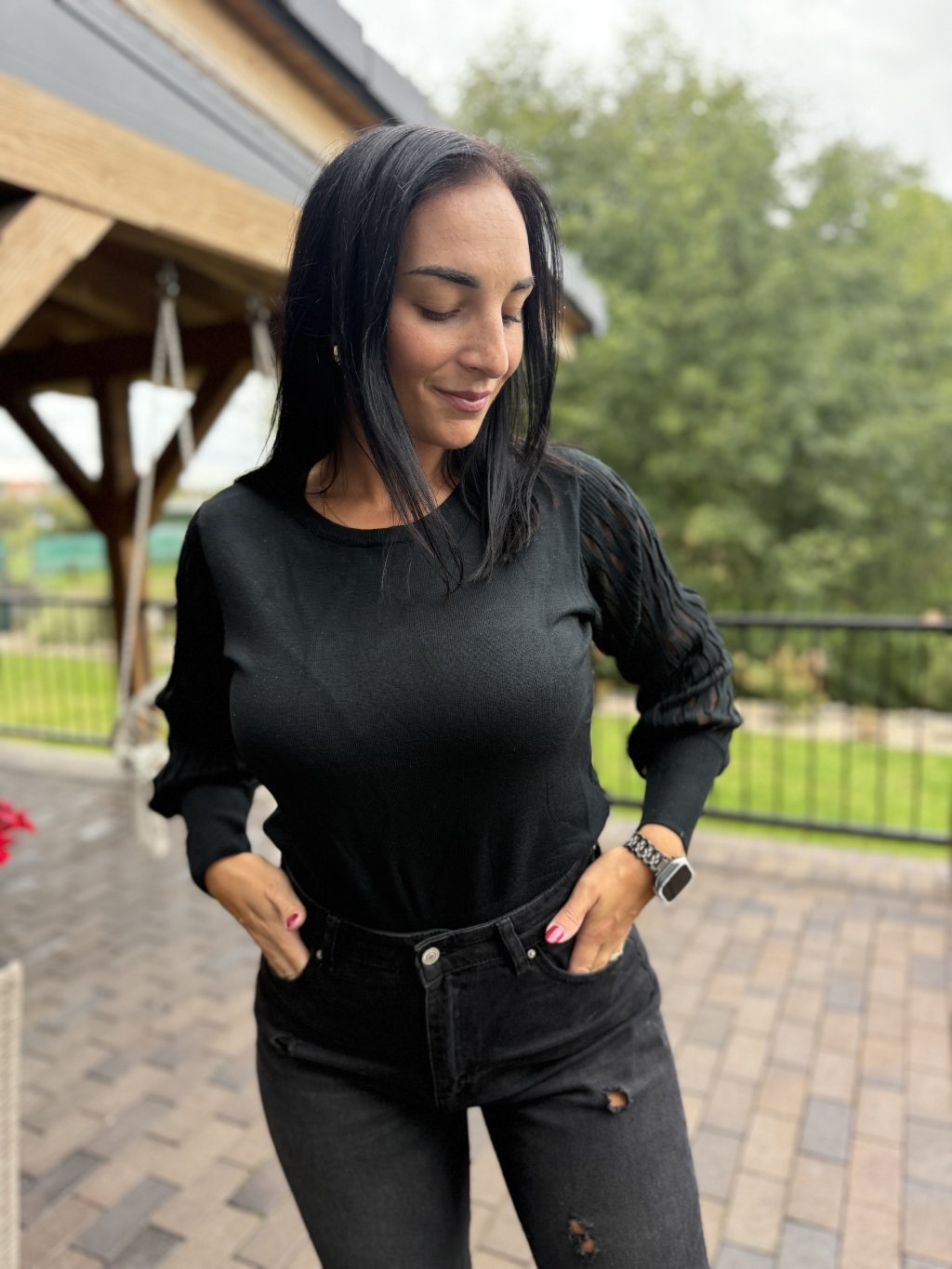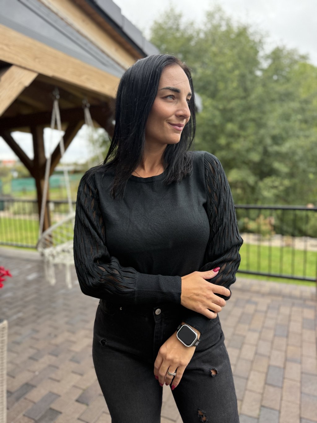 Elegantní dámský svetr v černé barvě, který kombinuje nadčasovou jednoduchost s moderním designem. Svetr je vyroben z hebkého, příjemného materiálu, který se pohodlně nosí po celý den. Největší pozornost přitahují originálně řešené rukávy s průpletovým vzorem, které dodávají outfitu jedinečný a ženský nádech.