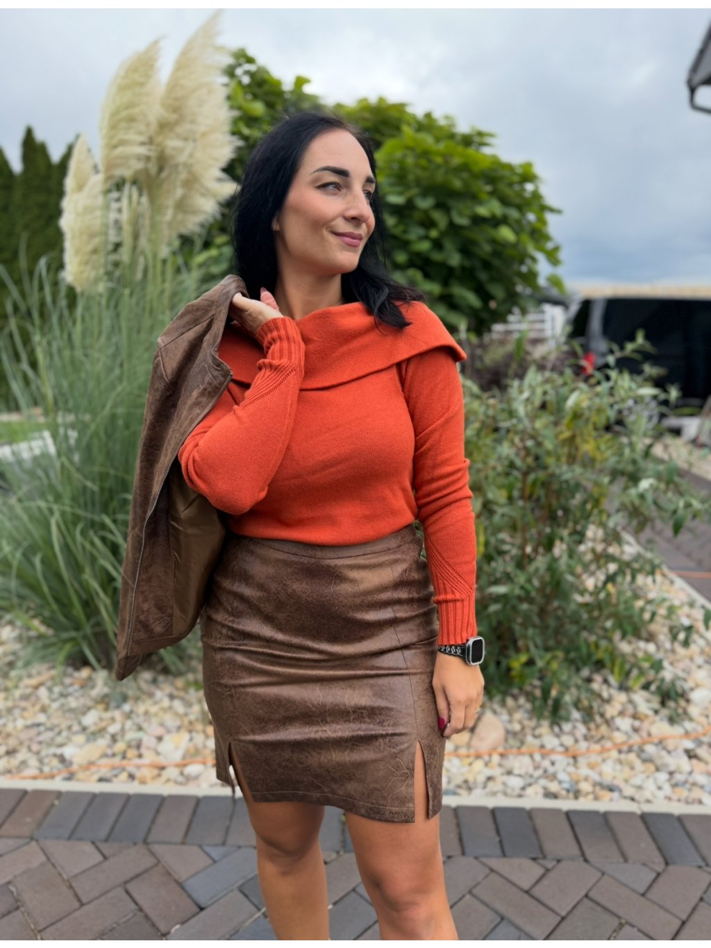 Rozzařte svůj outfit tímto stylovým dámským svetrem s odhalenými rameny v nádherné oranžové barvě. Svetr má originální spadlý límec, který dodává outfitu ženskost a šmrnc. Je vyroben z měkkého, hřejivého materiálu, který je příjemný na dotek a ideální pro podzimní či zimní dny.