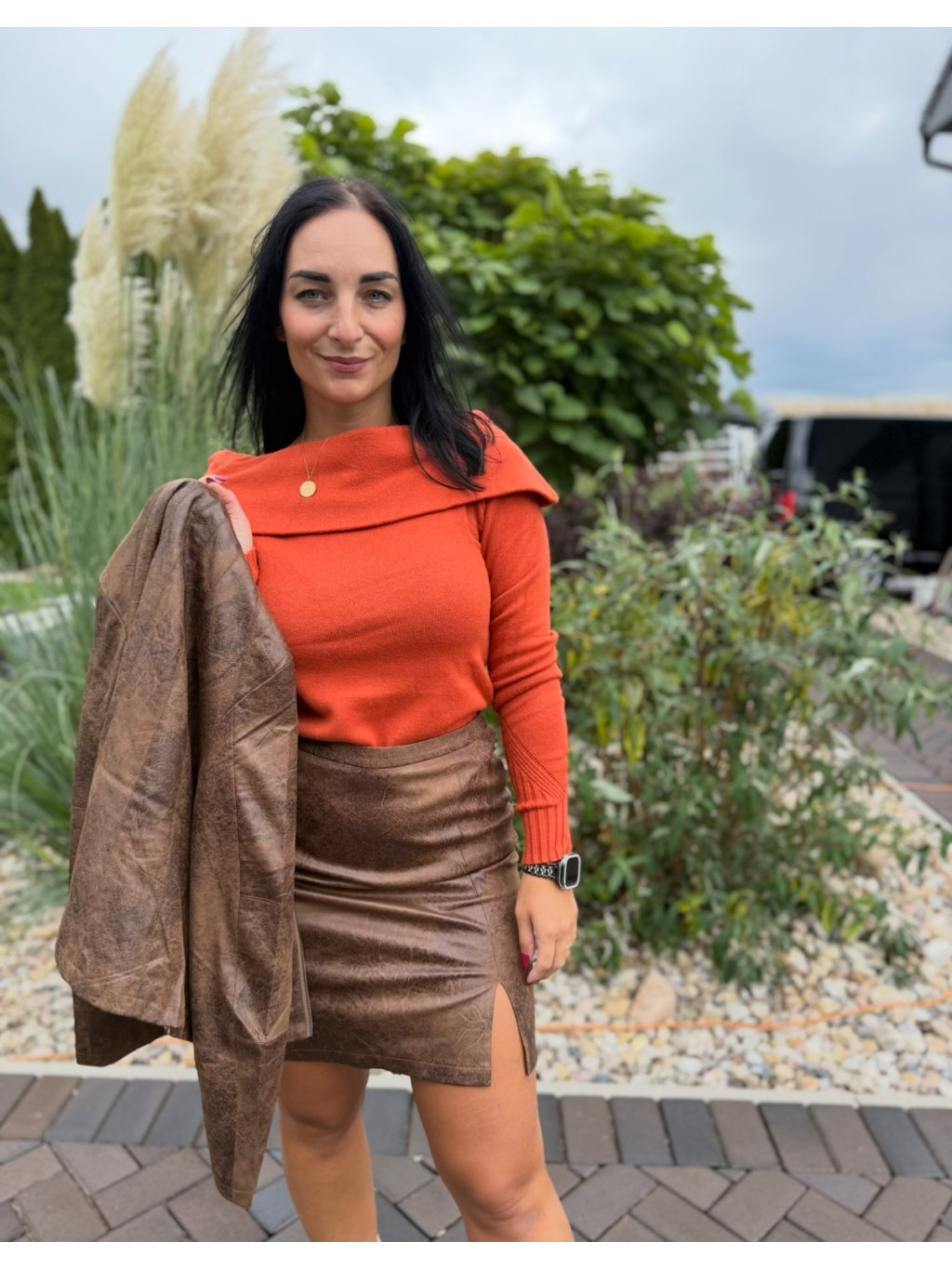 Dámský pletený svetr s odhalenými rameny – cihlový, elegantní a hřejivý