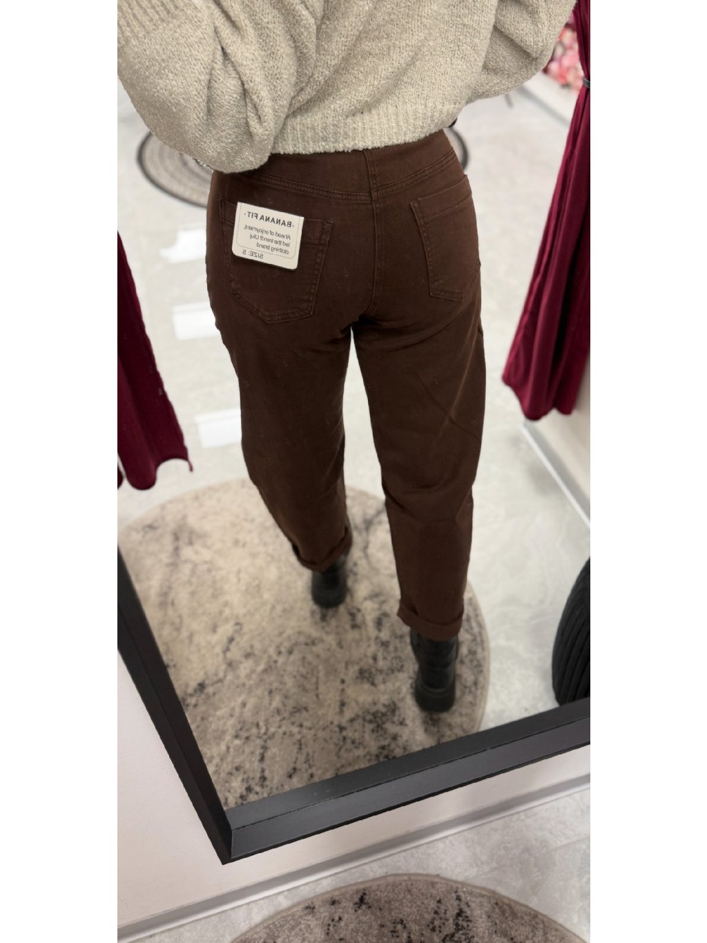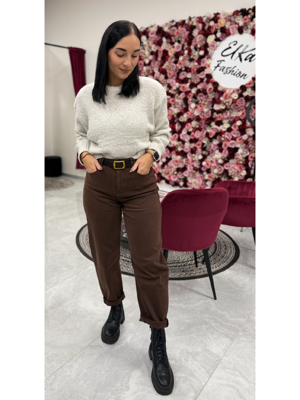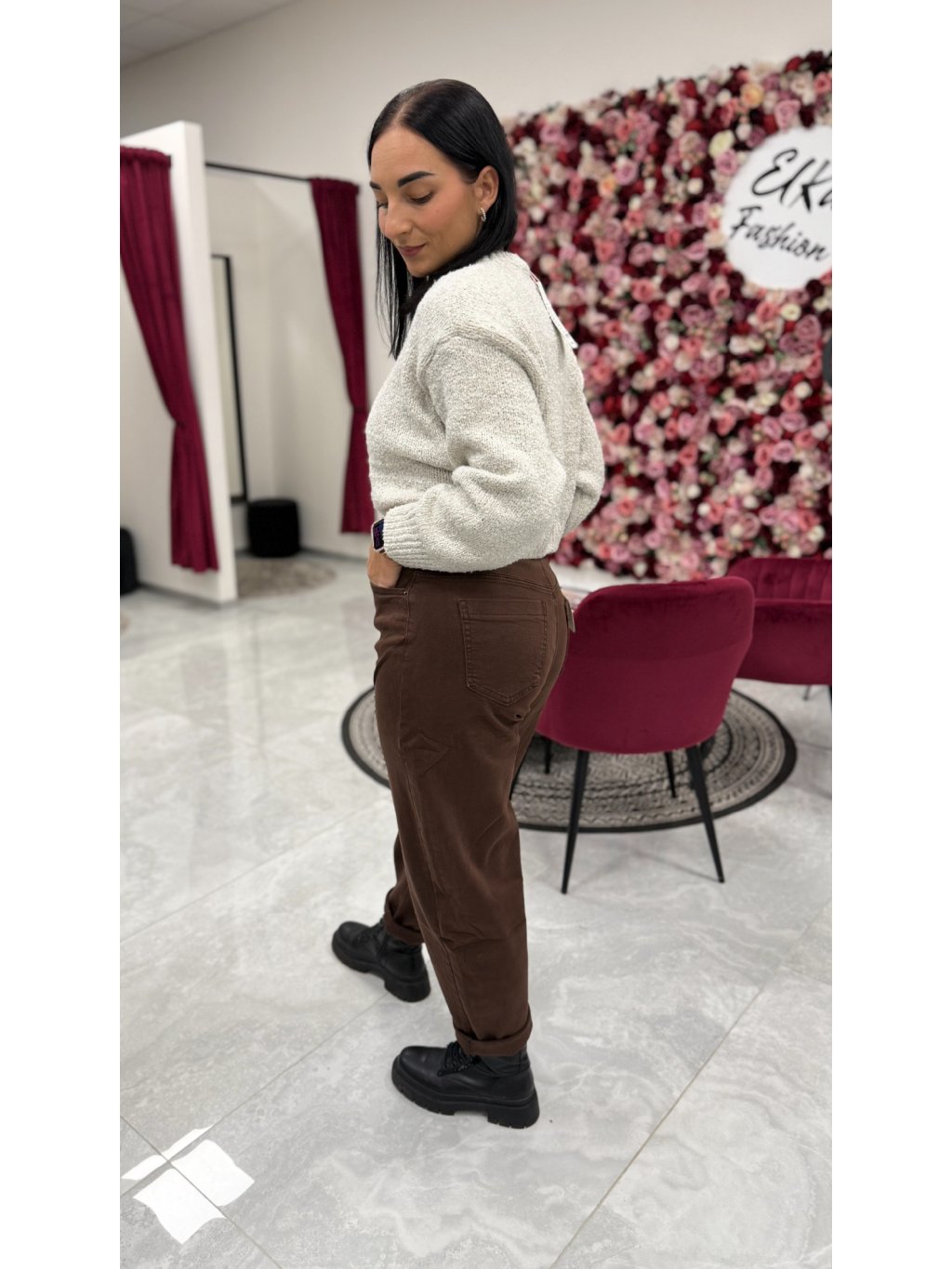 Tyto dámské hnědé kalhoty s vysokým pasem jsou ideální volbou pro moderní a pohodlný každodenní outfit. Jsou vyrobené z příjemného, lehce elastického materiálu, díky čemuž se skvěle přizpůsobí postavě a zajistí maximální komfort po celý den.