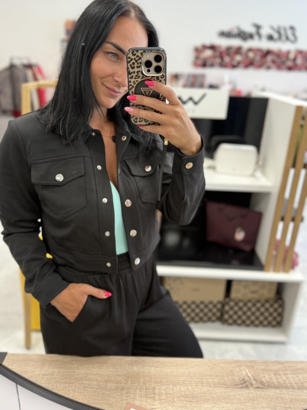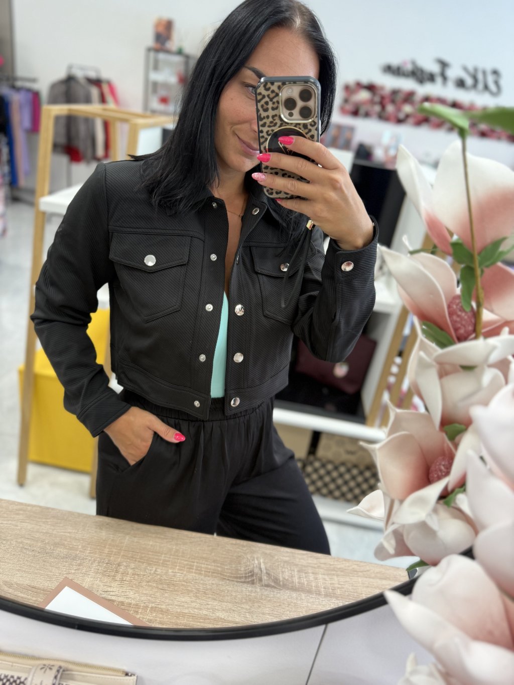 Stylová dámská krátká bunda, která se stane vaším nepostradatelným kouskem pro jarní i podzimní dny. Bunda má moderní zkrácený střih, klasický límeček a zapínání na kovové patentky. Praktické náprsní kapsy s klopami dodávají bundě ležérní šmrnc a zároveň podtrhují nadčasový design.