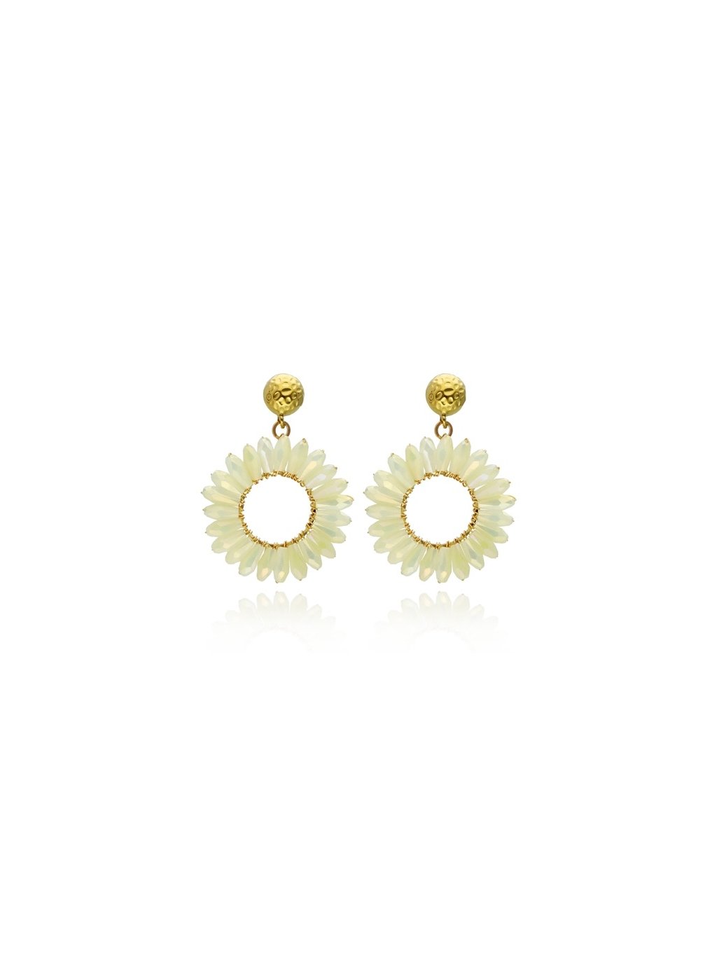 Oživte svůj outfit originálními náušnicemi z fazetového skla a nerezové oceli. Elegantní kulatý design s jemnými korálky v mintově zelených tónech a zlatými akcenty vytváří poutavý spirálový vzor, který okamžitě upoutá pozornost.