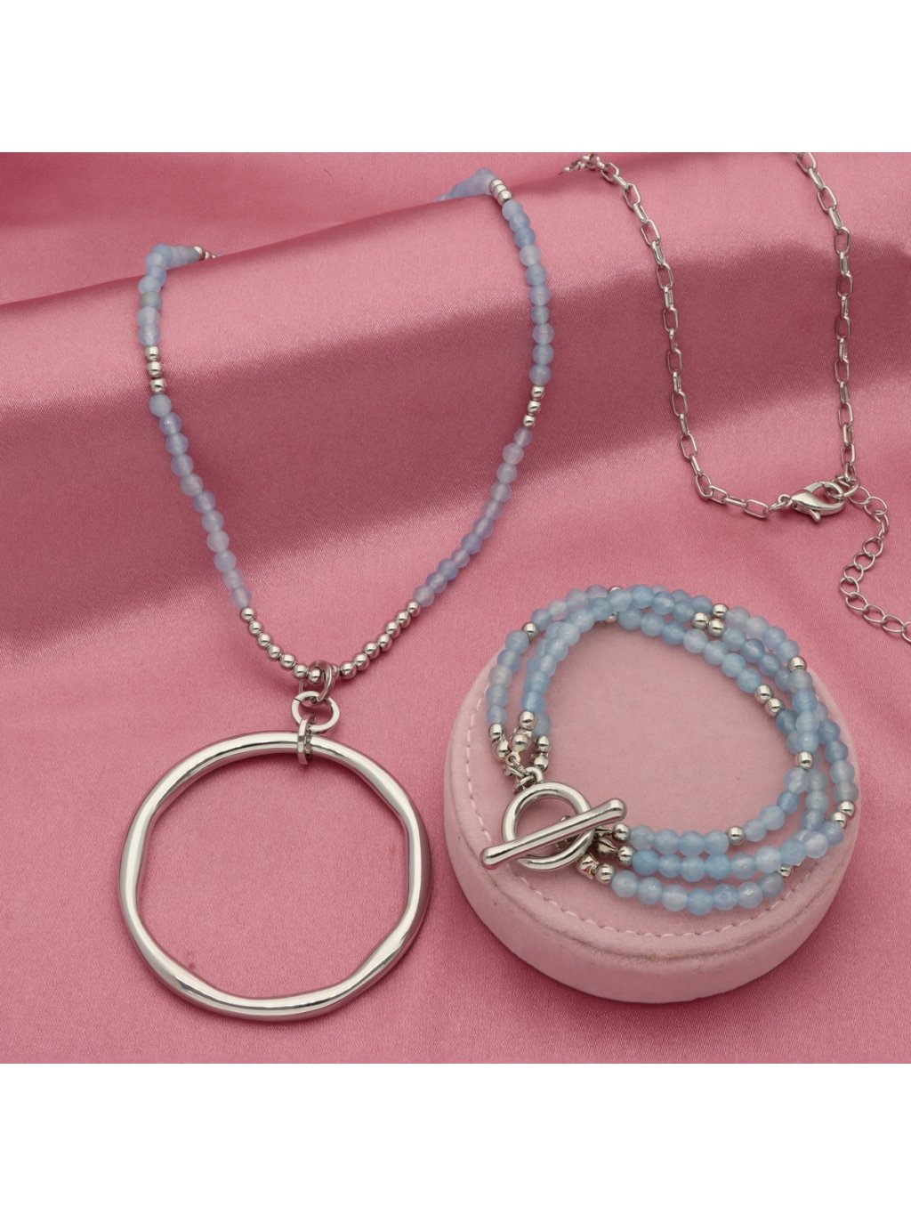 Elegantní dlouhý náhrdelník (70 cm + nastavitelný řetízek) z hypoalergenní mosazi, zdobený přírodními kameny akvamarínu a fazetovaným kouřovým sklem. Možnost sladit s odpovídajícím náramkem.