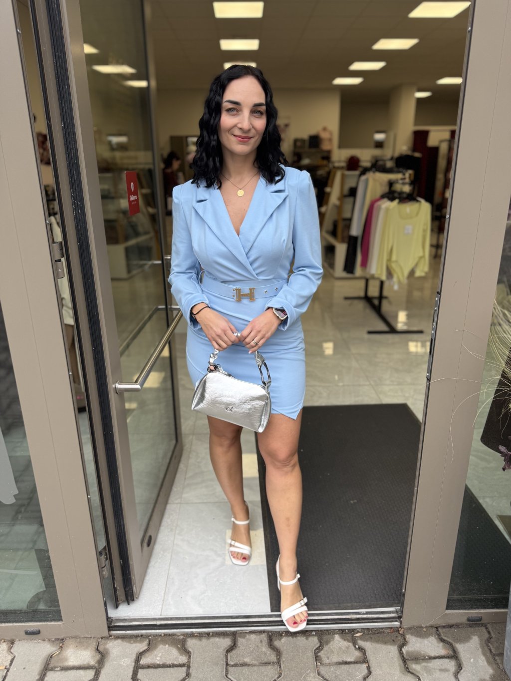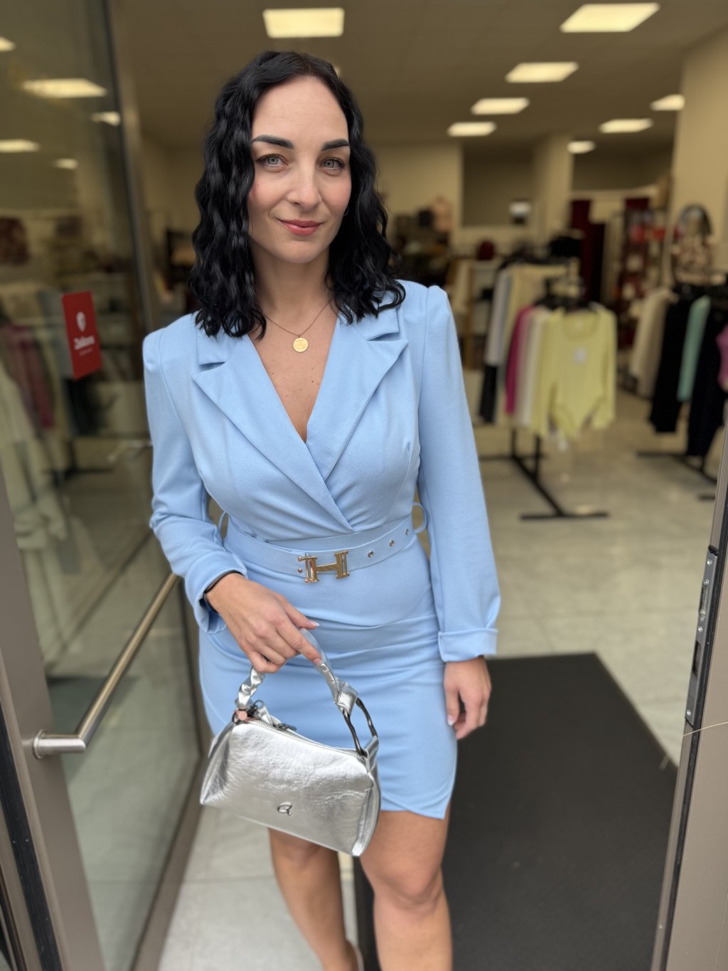 Součástí šatů je dekorativní pásek, který zvýrazňuje pas a dodává modelu luxusní vzhled. Kvalitní, příjemný materiál zajišťuje pohodlí při nošení a zároveň si zachovává svůj tvar po celý den. Délka šatů je nad kolena, což z nich činí univerzální kousek vhodný jak k lodičkám, tak i k sandálům nebo kotníkové obuvi.