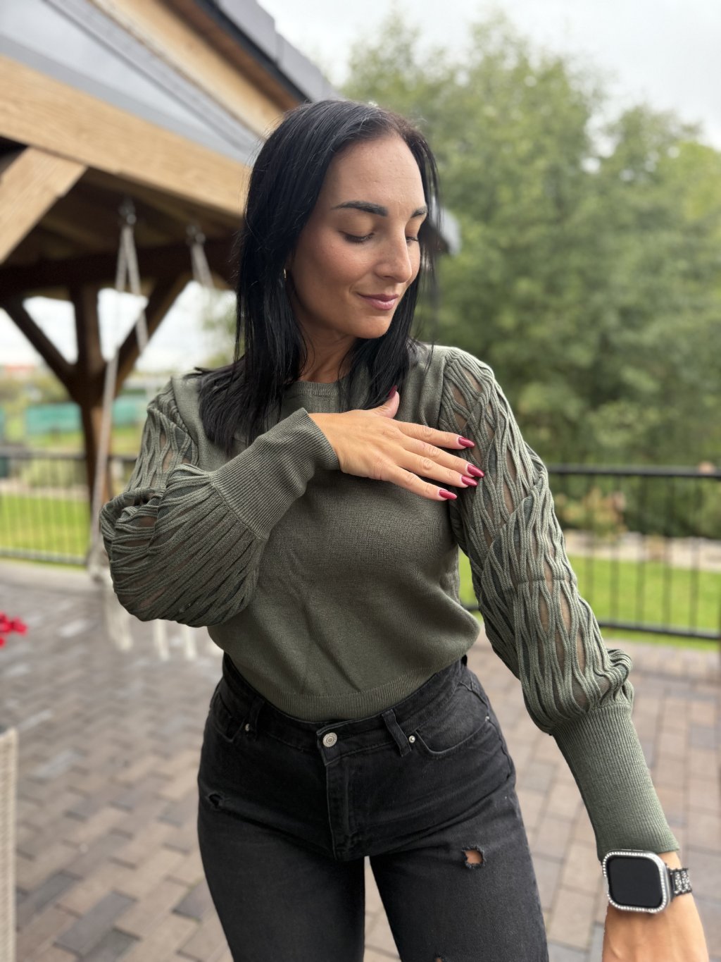 Elegantní dámský svetr v khaki zelené barvě, který kombinuje nadčasovou jednoduchost s moderním designem. Svetr je vyroben z hebkého, příjemného materiálu, který se pohodlně nosí po celý den. Největší pozornost přitahují originálně řešené rukávy s průpletovým vzorem, které dodávají outfitu jedinečný a ženský nádech.