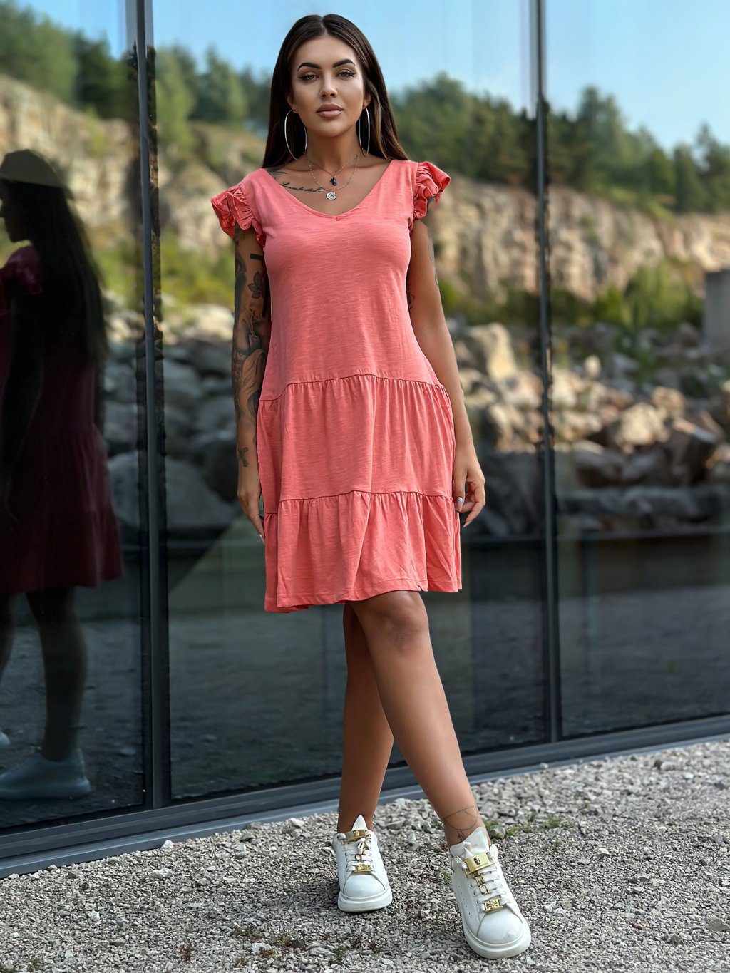 Korálové bavlněné šaty s volánky