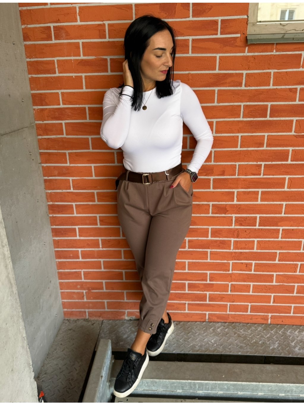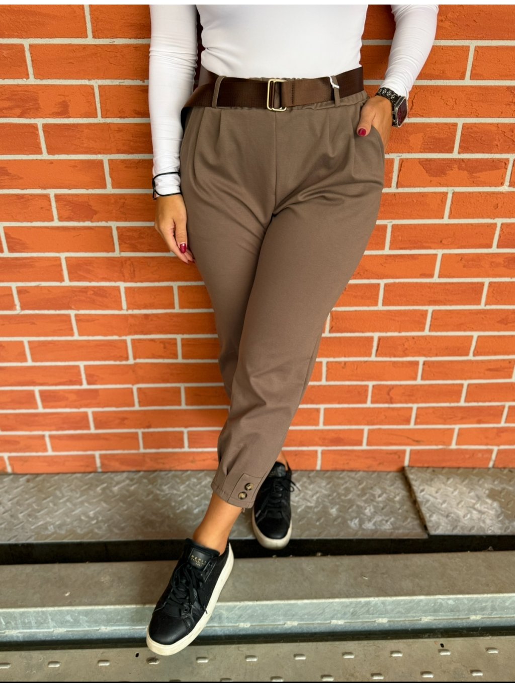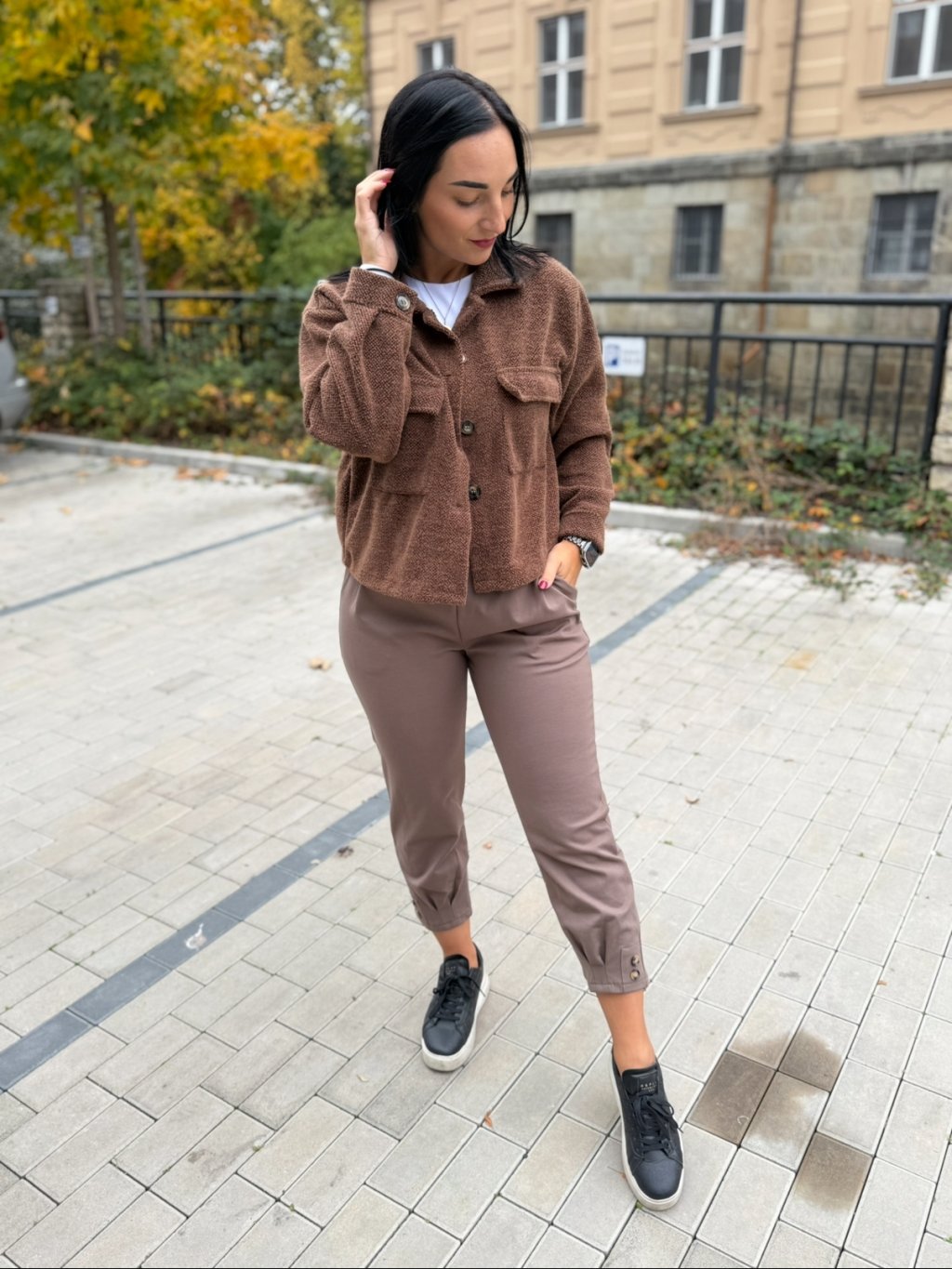 Stylové dámské kalhoty v čokoládové barvě jsou ideální volbou pro každodenní nošení i volný čas. Jsou vyrobeny z příjemného, pružného materiálu, který se skvěle přizpůsobí postavě a zajistí maximální pohodlí po celý den.