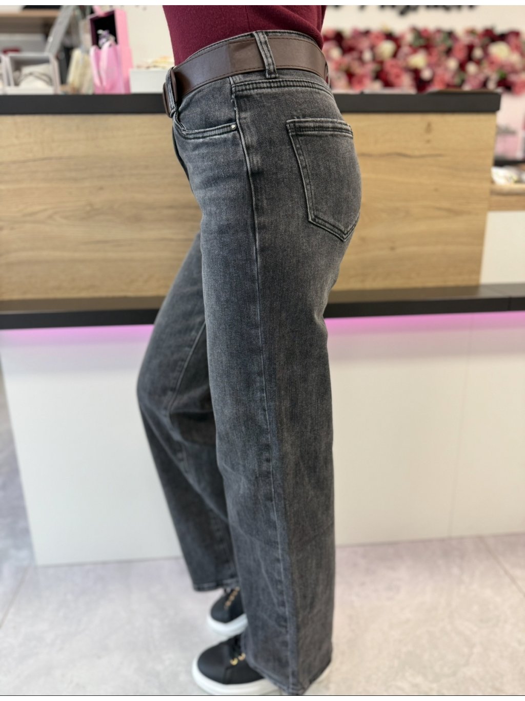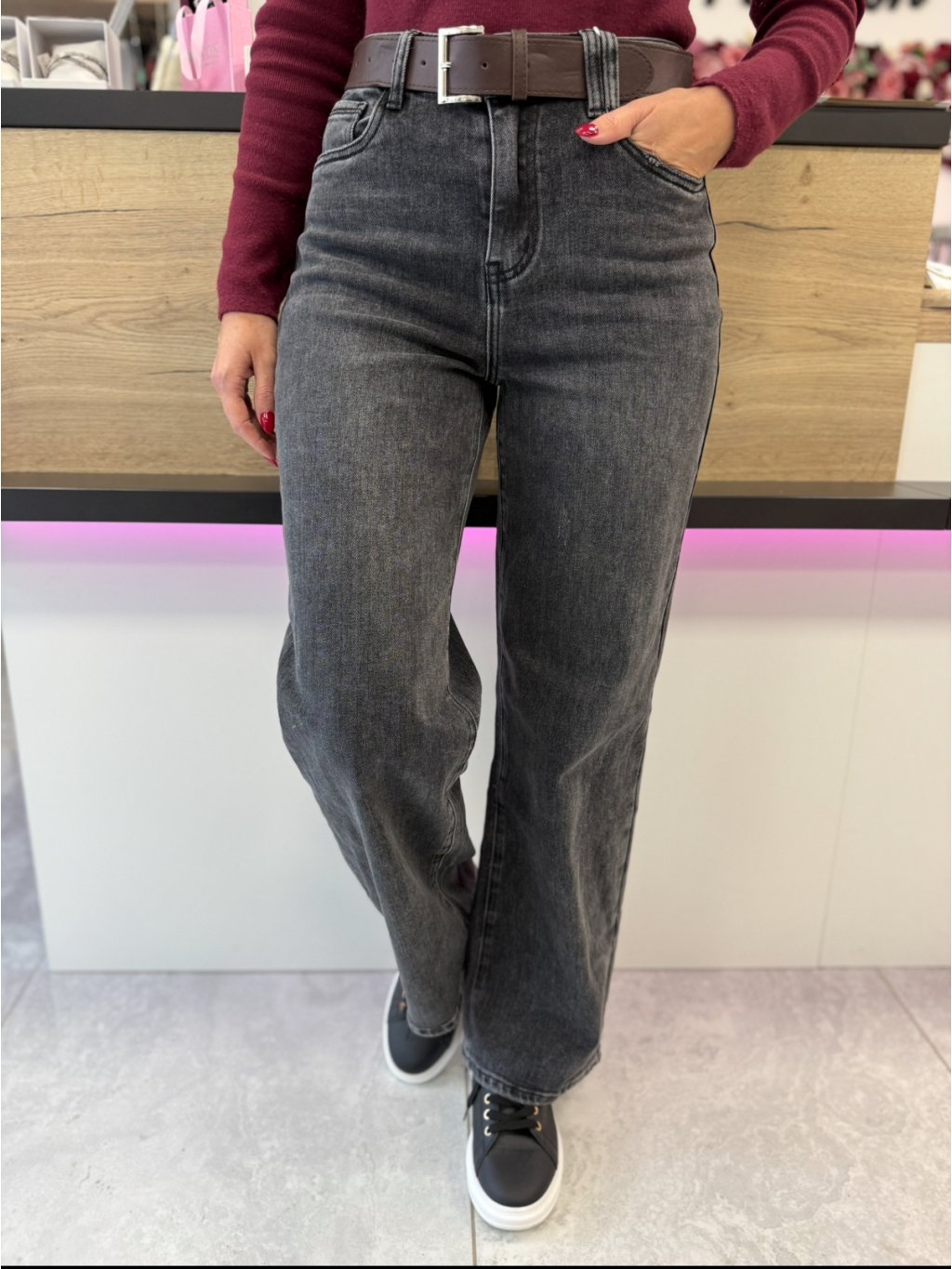 Tmavé džíny snadno zkombinuješ s elegantní halenkou, crop topem nebo basic tričkem. Styl doplňuje černý pásek se stříbrnou sponou, který dodává outfitu šmrnc.