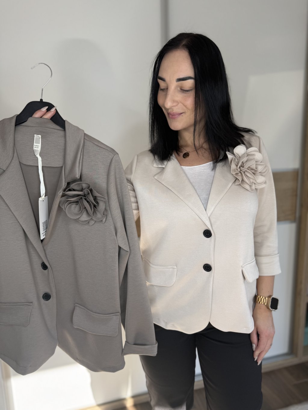 Sako má klasické zapínání na knoflíky, klopový límec a praktické přední kapsy, které podtrhují jeho nadčasový styl. Dlouhé rukávy dodávají moderní vzhled a umožňují snadné vrstvení s topem nebo halenkou. Dekorativní květina na klopě je elegantním detailem, který dělá z tohoto saka originální kousek vhodný do práce, na schůzku i na společenské příležitosti a zároveň je ODEPÍNACÍ.