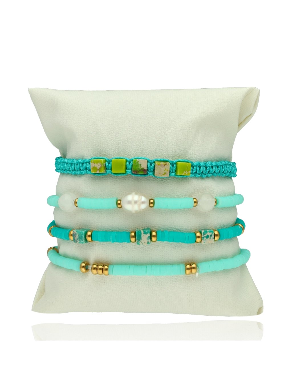 Ozdobeno sladkovodní perlou, barveným bílým kamenem a jadeitem, které dodávají náramkům přirozenou eleganci a jemnost.
