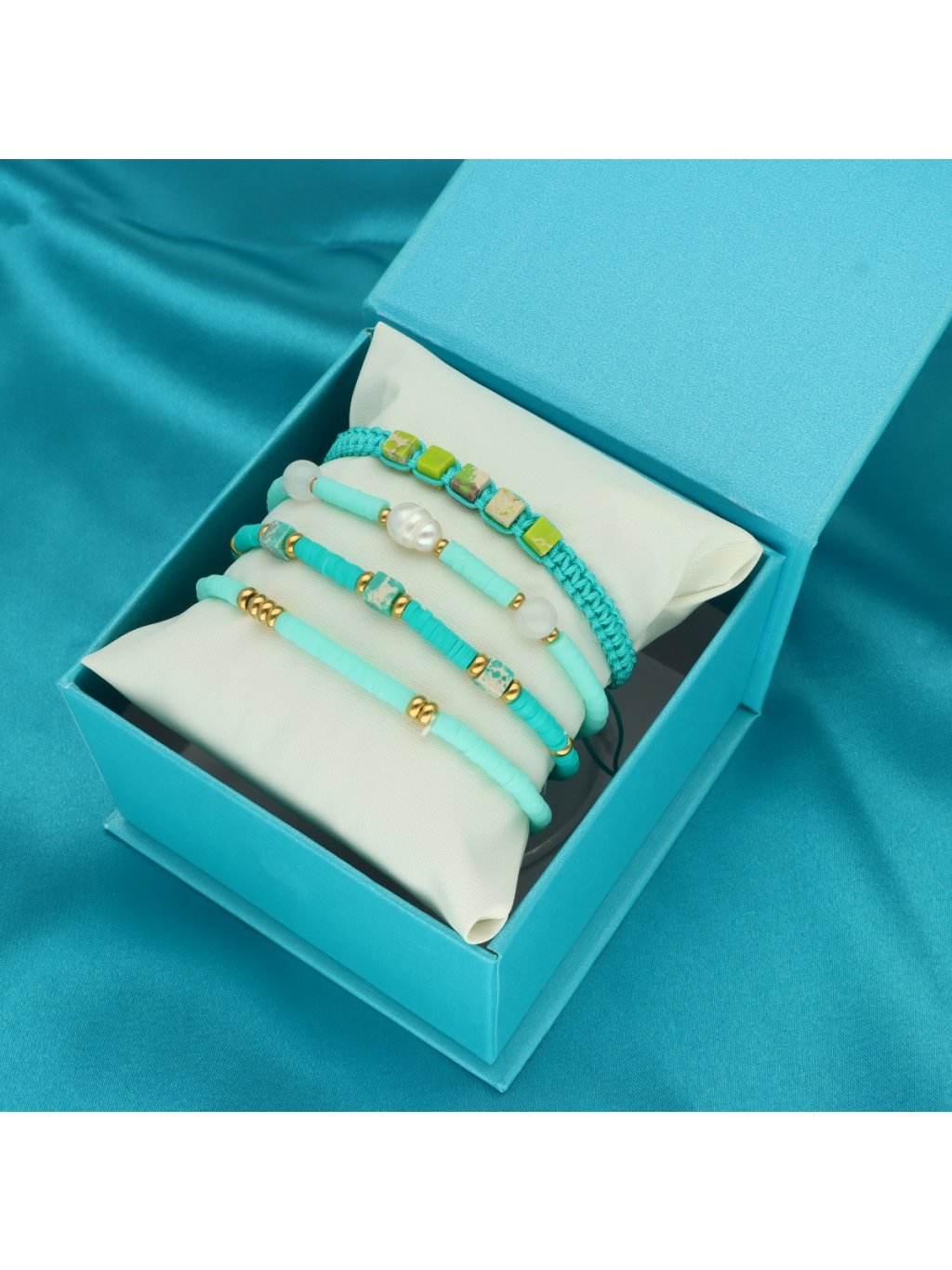 Exkluzivní balení – tyrkysová krabička s polštářkem, ideální pro dárek.