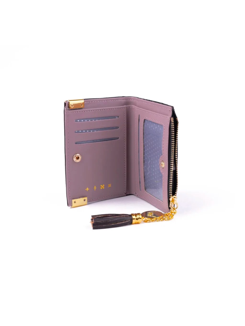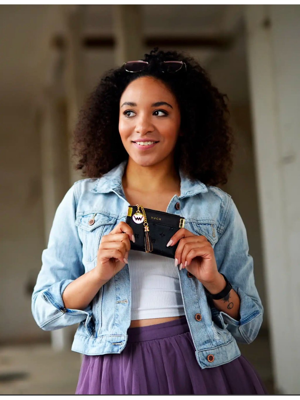 Černá se zlatými detaily je jistotou elegantního a šmrncovního vzhledu. Bezpečné zapínání na cvoček zajistí, že ti z peněženky Shuri nic nevypadne. Drobné dáš do samostatné kapsičky na zip, kterou zdobí výrazný doplněk na zlatém řetízku.